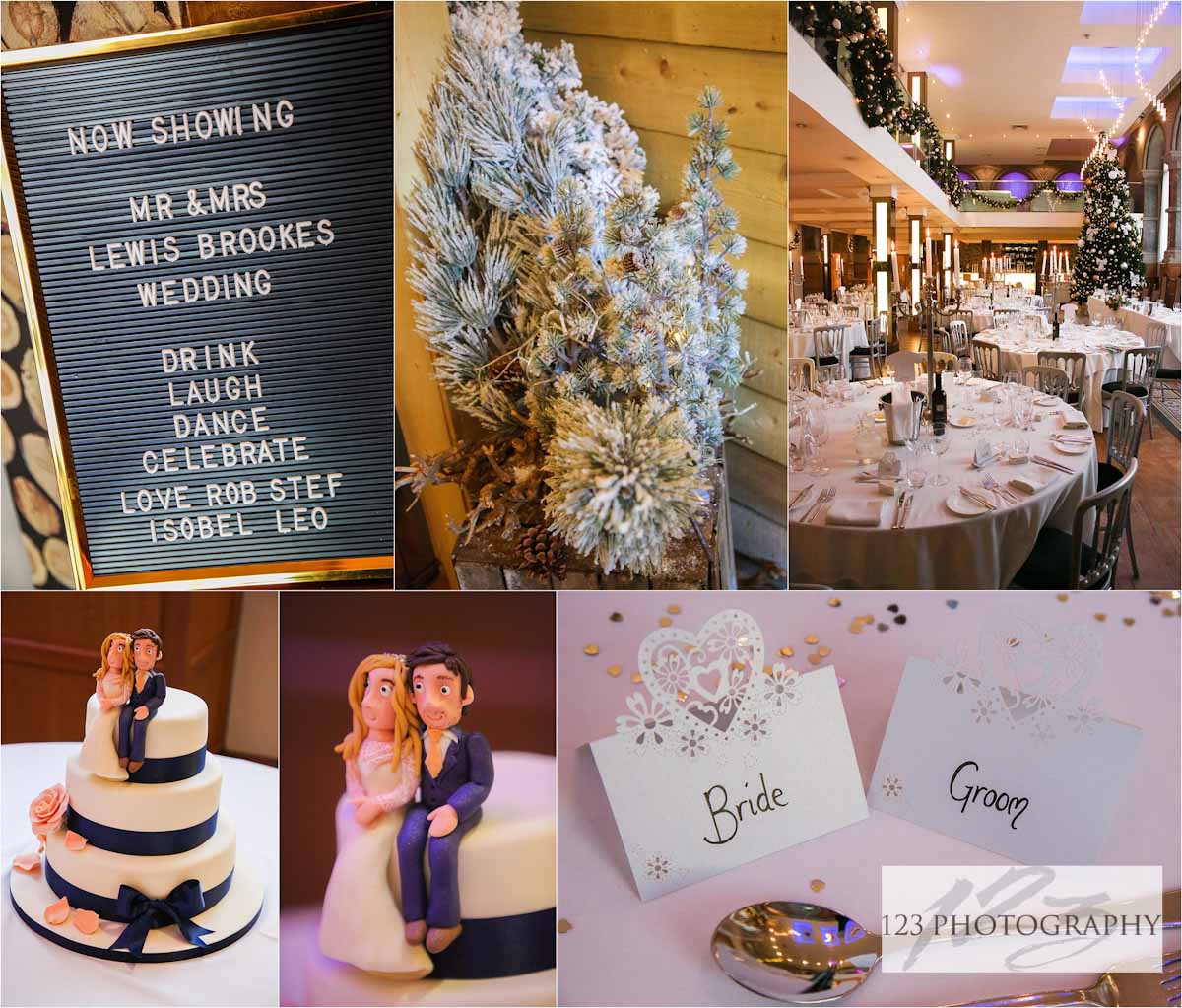 Then it was time to head over to Aspire Leeds for the wedding reception. After drinks and nibbles the wedding guests headed into the main dining room for dinner underneath a huge Xmas tree, Then it was time for the speeches. The groom was a big Leeds United fan so one of the team’s football songs made up part of the speeches.